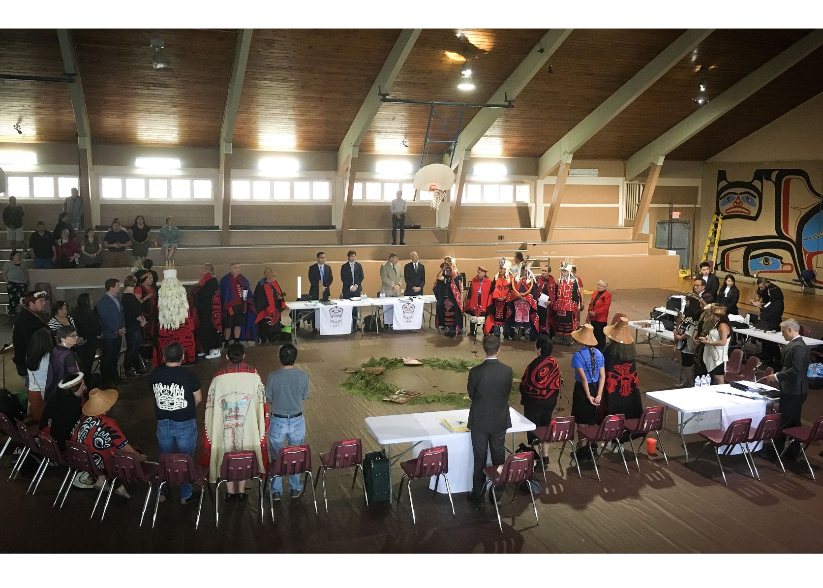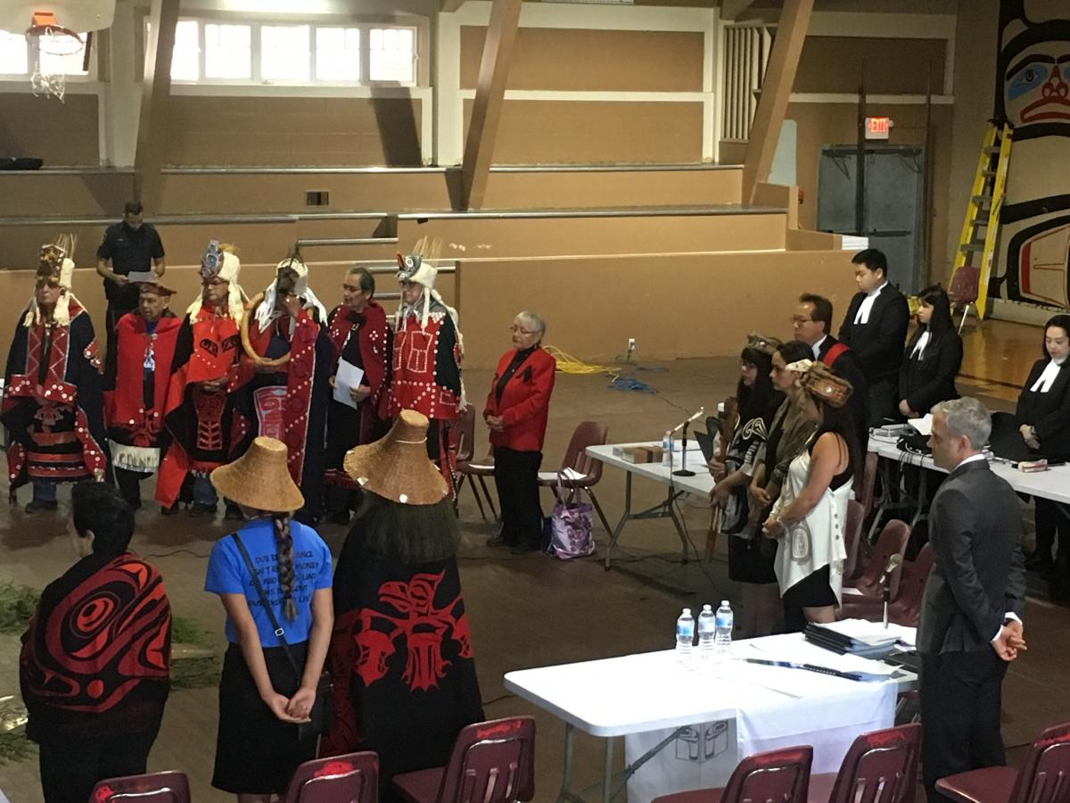 The hearing involved a unique mix of Heiltsuk and Canadian legal process operating in parallel. The linear, hierarchical structure of a Canadian courtroom was replaced by a traditional sentencing circle. Heiltsuk Yím̓as (hereditary chiefs) attended in their regalia, Judge Brent Hoy in his robes, lawyers in suits, courtroom workers in black, the vice president of Kirby, elders, youth, leaders and witnesses all sat together in a circle surrounding cedar boughs and copper shields that were ceremonially drummed into the centre.