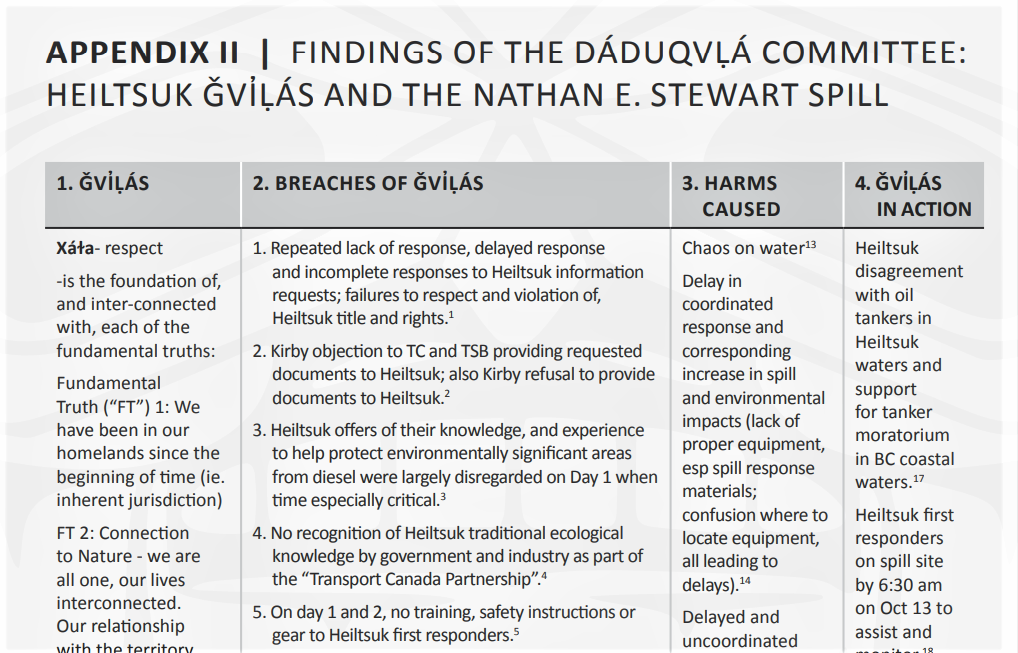 In response to the Nathan E. Stewart incident, the Heiltsuk Tribal Council established the Dáduqvḷá Committee “to assess and adjudicate the Spill in the context of Heiltsuk laws, known as Ǧviḷ̓ás, and prepare a written decision of its findings.” The first of its kind, the Dáduqvḷá qṇtxv Ǧviḷ̓ásax̌ - To look at our traditional laws adjudication report is a must-read.