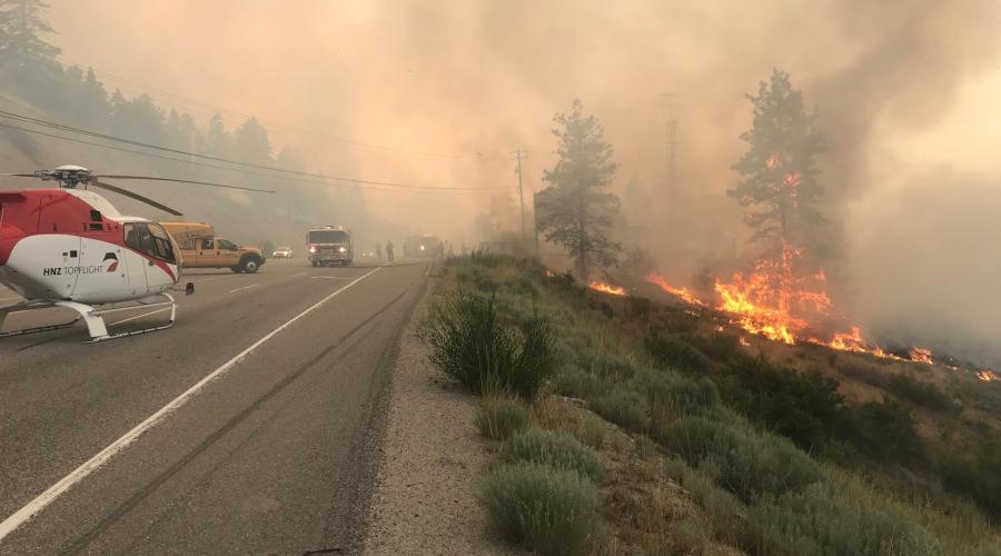 Top photo: Helicopter and response crews at a roadside wildfire near Peachland, BC. (BC Ministry of Transportation / Flickr Creative Commons)