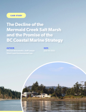This report spotlights the Mermaid Creek Salt Marsh in Sidney, BC (traditional WSÁNEĆ territories) as a case study to reveal problems with provincial coastal management and to suggest solutions. The report begins by discussing the Mermaid Creek Salt Marsh restoration project and the issues it encountered with riparian rights. It then makes recommendations for legal reform the Province can carry out under its Coastal Marine Strategy to create a system that better balances riparian rights with habitat conservation and supports projects like the Mermaid Creek Salt Marsh Restoration project.