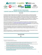 The report card was co-authored by: West Coast Environmental Law Association, Centre québécois du droit de l’environnement (CQDE), Ecojustice, Environmental Defence, MiningWatch Canada, Nature Canada, WCS Canada and Yellowstone to Yukon Conservation Initiative