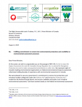 Organizations signed on to the open letter include: West Coast Environmental Law, Environmental Defence, Quebec Environmental Law Centre (CQDE), Canadian Freshwater Alliance, Ecojustice, Miningwatch Canada, Nature Canada and WCS Canada.