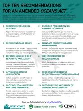 In June 2017, the federal government tabled Bill C-55, proposing changes to Canada’s Oceans Act. Unfortunately, Bill C-55 does not go far enough in providing effective protection for marine protected areas (MPAs) under the Act. This document includes 10 key recommendations for amending the Oceans Act to establish minimum protection standards for MPAs, enhance public accountability, and recognize Indigenous co-governance and enforcement.
