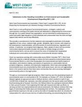 This submission to the Standing Committee on Environment and Sustainable Development expresses West Coast Environmental Law Association's strong support for Bill C-230. The submission affirms the need for a national strategy to redress the harm caused by environmental racism, and describes some examples highlighting the impacts of environemental racism from our experience working with communities across British Columbia.